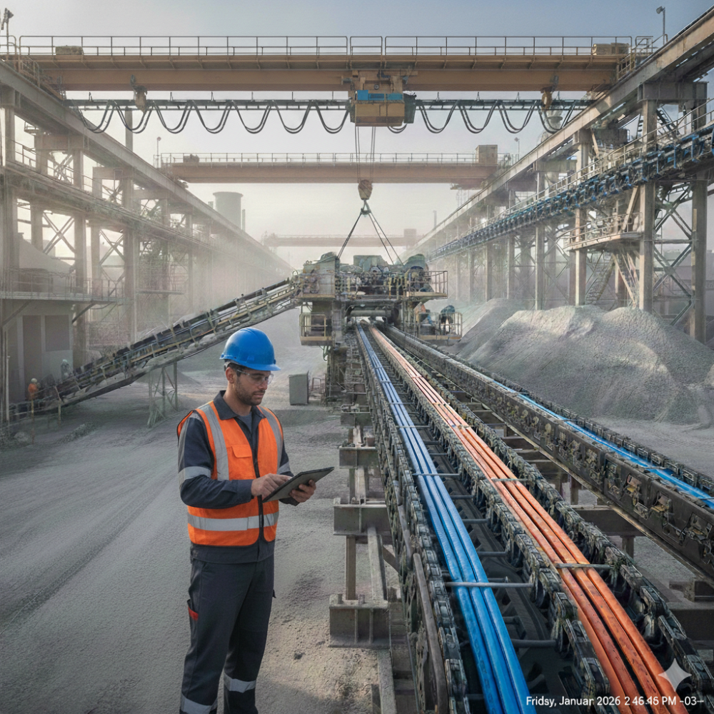 Nesse cenário, o sistema de alimentação elétrica tem papel fundamental. Sistemas festoon tradicionais podem apresentar desgaste acelerado e demandar manutenção frequente, especialmente em operações contínuas. A substituição por esteiras porta cabos oferece uma alternativa mais robusta, garantindo condução protegida dos cabos, maior confiabilidade operacional e menor necessidade de intervenção ao longo do tempo.