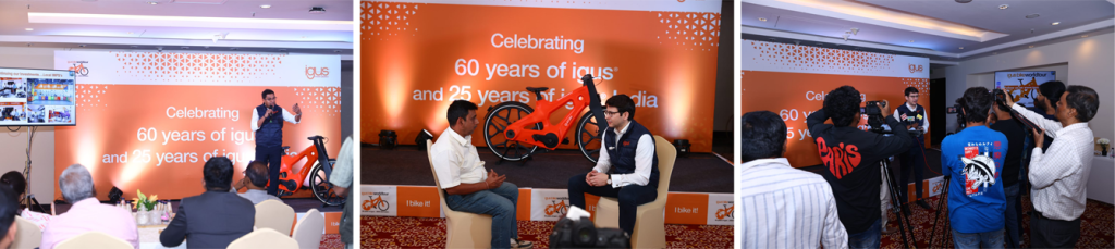 A bicicleta fez uma parada importante no Indian Institute of Science (IISc) em Bangalore, onde foi experimentada pelo CEO da unidade de Novos Negócios drytech, Thilo Schultes, enquanto explorava a academia verde. Mais tarde, foi realizada uma noite de lançamento suave, com líderes da indústria discutindo a importância da igus:bike na promoção da economia circular e sua contribuição para um futuro sustentável.
