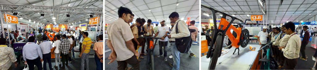 A igus:bike chamou a atenção na IMTEX 2025, maior feira de máquinas-ferramentas da Ásia. Ela foi um sucesso no estande da igus, com visitantes e influenciadores se encantando com seu design livre de lubrificação e totalmente feito de plástico reciclado. O ciclista Sohel demonstrou a bicicleta pelo estande, encantando a multidão com sua suavidade e inovação.