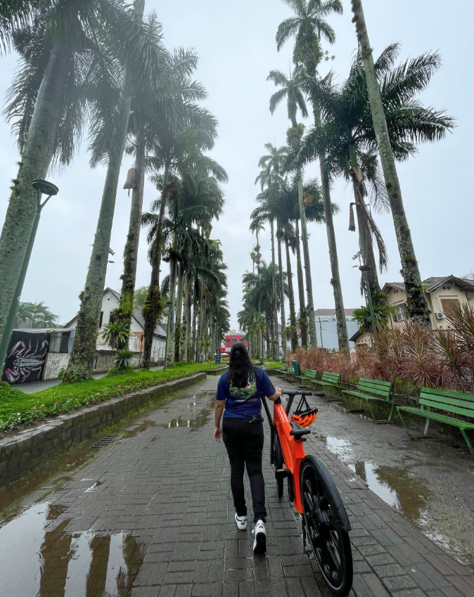 Mesmo com a chuva, a equipe decidiu continuar o passeio de bicicleta pela cidade. O trajeto passou por alguns dos pontos mais icônicos da região, incluindo o Museu Nacional de Imigração e Colonização, localizado no início da famosa Rua das Palmeiras.