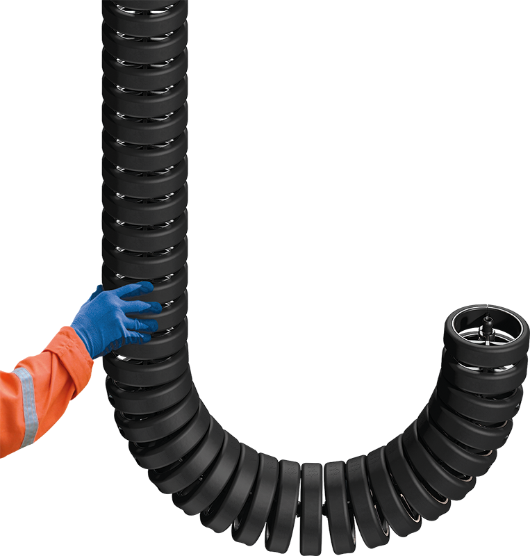 O e-loop® é um sistema modular de esteira porta cabos concebido para aplicações “pendentes” e tridimensionais, capaz de acomodar cabos elétricos, sinal e até mangueiras hidráulicas dentro de um conjunto compacto. Diferente do service loop (loops de cabo solto), o e-loop controla o raio de curvatura, minimiza esforços e protege individualmente cada cabo — permitindo substituição rápida e manutenção local.